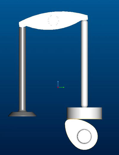 A fenti képen egy egy-vezérműtengelyes, négyszelepes motor szelepvezérlés részlete látható. Ennek a konstrukciónak az óriási előnye az alacsony beépítési magassága. Hátránya viszont a szelephézag manuális állítása, mivel hidrotőke beépítésével már jelentősen megnőne a beépítési magasság. Viszont az erőkar változása miatti - fentebb részletezett - problémák itt is jelen vannak, nem is kis mértékben. Ahhoz, hogy ezt kompenzálni lehessen, jóval nagyobbnak kellene lennie a himba forgástengelye és a vezérmű tengelye közti távolságnak, mint a másik oldal erőkarjának. Viszont így a bütyök emelése is nagyobb kell, hogy legyen, mint a számunkra szükséges szelepemelés mértéke, így viszont nőnek a méretek is... Vagy pedig marad a nagyon eltorzult, aszimmetrikus geometriájú bütykök.