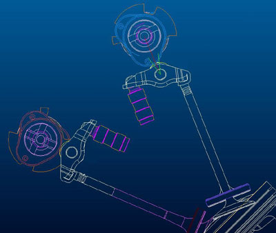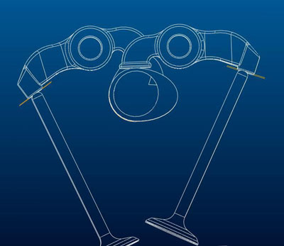 Ezen a képrészleten egy hengerenkénti négyszelepes (külön szívó-, és külön kipufogóoldali vezérműtengellyel) V-motor kis részlete látható. Ami érdekes az egészben, hogy a hidrotőke áll, és a himba közepére hat a bütyök. Előnye, hogy a nagyon kicsik mozgó tömegek, ami miatt jóval kisebb rugóerőket kíván a szelep, így a szelepek tömegét is csökkenteni lehet (nem fog leszakadni a szeleptányér a szelepszárról), kisebb szilárdság is elegendő. A kisebb szelepszár vastagság (6mm) kisebb tömeget jelent és nem elhanyagolható, hogy kisebb áramlási ellenállást is. További előnye azáltal, hogy a hidrotőke nem mozog, hogy a nyomás alatti olaj állandóan ott áll "készenlétben" a hidrotőke pufferterében és ha a nagynyomású térben olajveszteség lép fel, azonnal tudja pótolni. A CVH motorban a tőke mozgása miatt, amíg mozog a tőke, le van zárva a furat, így jelentősen kevesebb ideig van lehetőség pótolni a tőkékből elszivárgott olajat.