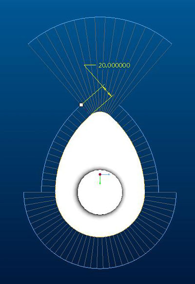 És most egy kicsit a bütykökről. Bármennyire is olyan egyszerűnek tűnik, mint egy 100-as szög, azért egy "picit" összetettebb a kérdés. Egyes (egyetemi) tankönyvekben még említést tesznek a 3 ívből összeálló bütyökről, de szerintem már nagyon-nagyon sok éve nem létezik ilyen új konstrukcióban. Ennek nagy előnye, hogy egy körzővel és az emelés belekalkulálásával körülbelül 38mp alatt megrajzolható a beméretezett bütyök. Aztán azon túl, hogy "végül is ez is működik", más jót nem is lehet mondani róla. Zajos, iszonyatos erőkkel terheli a vezérmű-részeket és ezáltal több nagyságrenddel nagyobb kopást idéz elő, mint a többi geometria. Ez így néz ki: