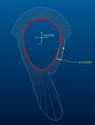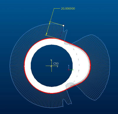 Ezen a ábrán azzal az első képen látható kezdetleges OHV vezérléssel kísérletezgettem, milyen bütyökprofilra van szükség ahhoz, hogy a szelepek szinuszosan mozogjanak. Természetesen a töltetcsere szempontjából az ideális az lenne, ha nulla szelepnyitási és szelepzárási időkkel lehetne számolni és közöttük pedig végig maximális lökettel lennének nyitva a szelepek. De ez nem valósítható meg, és a mechanikus igénybevételek miatt szép "lágy" mozgást kell megvalósítani, aminek mondjuk egy szinuszos mozgás meg is felel. Az én legnagyobb meglepetésemre (is) ez nem szimmetrikus bütyökprofilt feltételez. Ennek a bütyöknek a görbületén jól látszik, hogy a görbületi vonal mindenhol folytonos, csak nem mindenhol érintőleges. Ez a bütyökprofil már másodrendben is érintőleges, mivel a rádiuszok értékének a változásában nincs ugrás, teljesen folytonos. Ezzel gyakorlatilag már teljesen ki vannak küszöbölve a "függőleges események", így nincsenek túlterhelve mechanikusan a vezérműrészek.