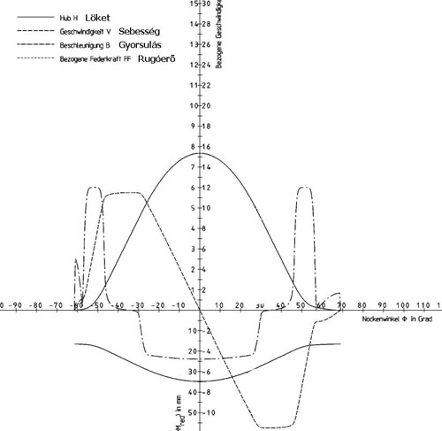 Ez a kép a fenti bütyök által megvalósított mozgásjellemzőket ábrázolja. A közel szinuszos folyamatos vonal a szelepnyitás görbéje. A diagram tengelymetszetén átmenő szaggatott vonal a szelep sebesség-görbéjét, míg a pontvonal a szelep gyorsulásgörbéjét ábrázolja. A vízszintes tengely alatt a rugóerő látszik. Amit érdemes kielemezgetni egy kicsit, az a gyorsulásgörbe. Látható, hogy a szelep nyitásakor és a szelep zárásakor lép fel a legnagyobb gyorsulás. A szelep nyitásakor azért, mert az álló szelepet kell viszonylag rövid idő alatt mozgásra kényszeríteni, és ha a szeleprészek között akár csak 0.2mm hézag is van (ez nem azonos a beállítandó szelephézag értékével, ez az üzemi körülmények között megmaradó hézag), akkor 7000-es percenkénti fordulatnál simán felléphet egy impulzusszerű 30000G-s (!!!) gyorsulás. (Számszerűen: 5 ezred másodperc alatt nulláról több, mint 500km/h!!!) (Vagy úgy kézzel foghatóbb, hogy 0.1mp alatt nulláról 10800km/h...?!?) :-D Mondanom sem kell, hogy ezt azért nem sok minden bírja ki. Ez persze elméleti görbe, és ez a gyorsulásérték még talán ezredmásodpercekig sem tart, s a valóságos anyagoknak van rugalmasságuk is, tompítják ezt, de túl csúnyák az eredeti értékek ahhoz, hogy ebből egy megnyugtató értéket kaphassunk. És körülbelül ilyen gyorsulásértékekről beszélhetünk akkor is, ha homorú bütyköt használunk görgős emelő nélkül. A szelepzáráskor pedig azért van nagy gyorsulás, mert a szelep közel egyenletes sebességgel zár és közelít a szelepülékhez, majd hirtelen kell megállnia, amit egyrészt a bütyök vége próbál lassítani, amit pedig nem sikerül, az csattan, majd pattog a szelepüléken.