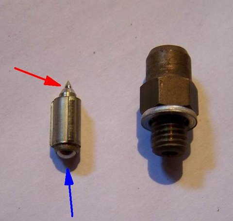 Ezen képen jól látható a régi konstrukciók hátránya, ahol a tűszelep záró felülete rézből volt és a sok nyitás-zárás és rezgés miatt szépen ki is kopott (piros nyíl). Ez a kopás akár több mm-rel is elállíthatja az úszó gyárilag beállított magasságát, teljesen felborítva a benzin-levegő arányát.
