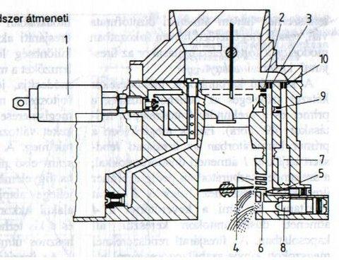 Ezen az ábrán lévő karburátoron van még egy szokatlan rész, amit a (8), (9) és (10) jelű alkatrészek alkotnak a (7) csatornával együtt. Ennek kombinált a feladata: a (8)-as csavarral a motorba jutó keverék mennyisége állítható, nem a minősége. Vagyis nem a fojtószelep nyitásával, zárásával kell szabályozni az alapjárat fordulatszámát, hanem a fojtószelep állásától függetlenül állítható be meglehetősen pontosan az alapjárat fordulatszáma és CO-értéke. Ennek óriási előnye, hogy mivel a fojtószelepet teljesen be lehet zárni, motorfék üzemben pedig úgy is lezárja a mágnes-szelep az alapjárati benzin útját, ezért sokkal erősebb motorfék érhető el.